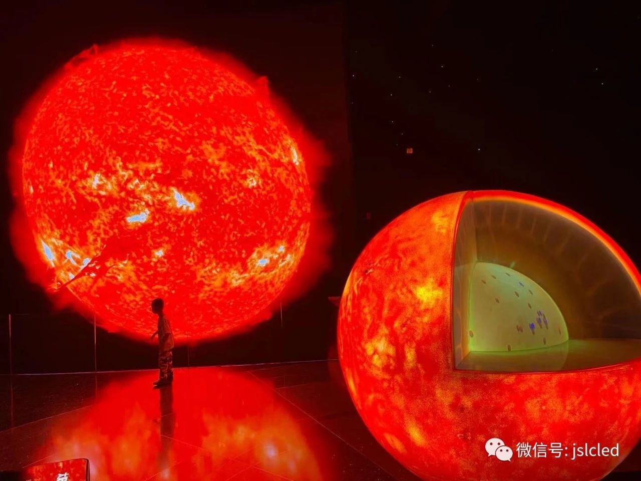 江蘇亮彩憑借豐富的項目經驗及過硬的產品品質,獲得了參與上海天文館的大屏建設機會,為場館承制了兩塊LED顯示屏,分別是“家園”主題展區內太陽屏和拱形屏